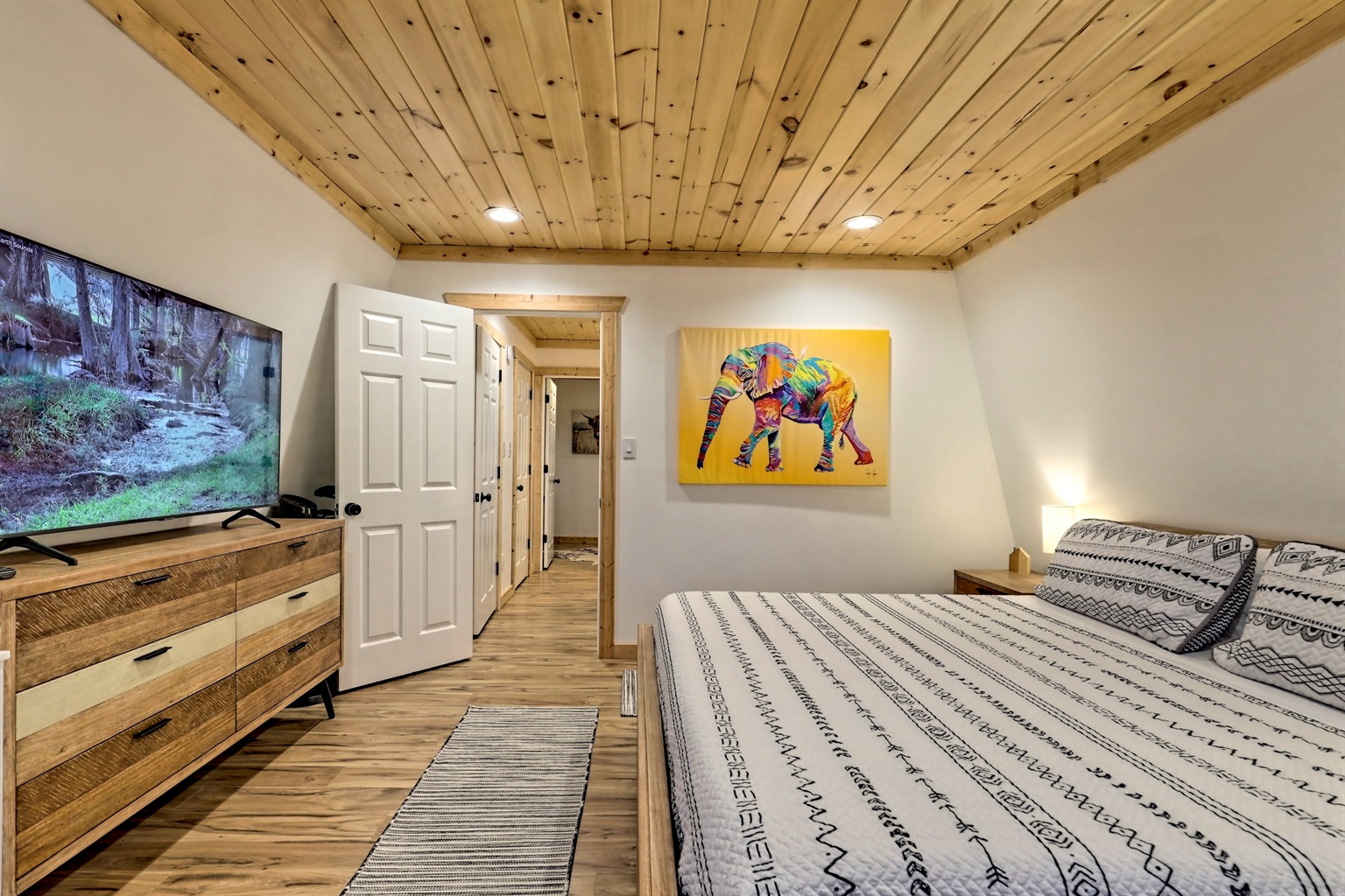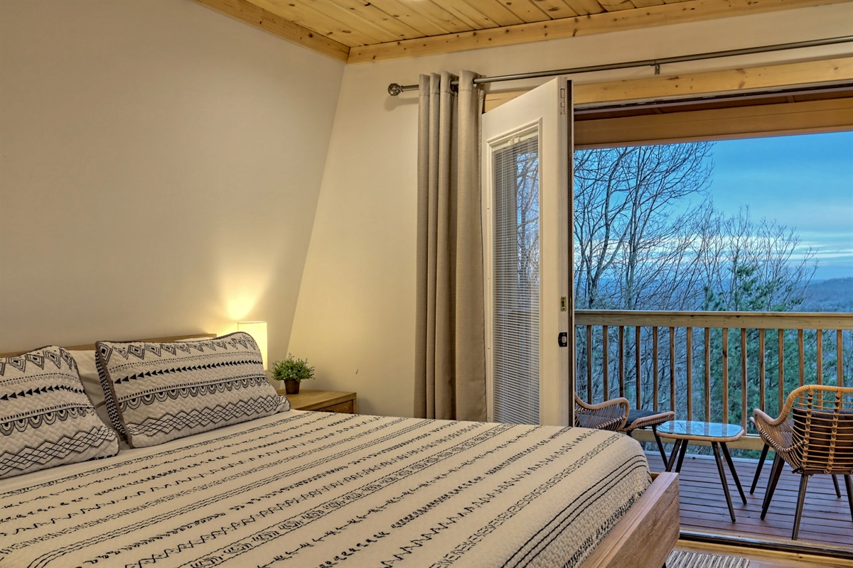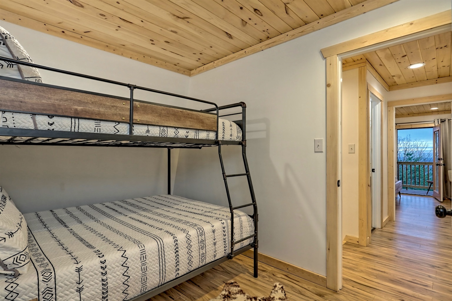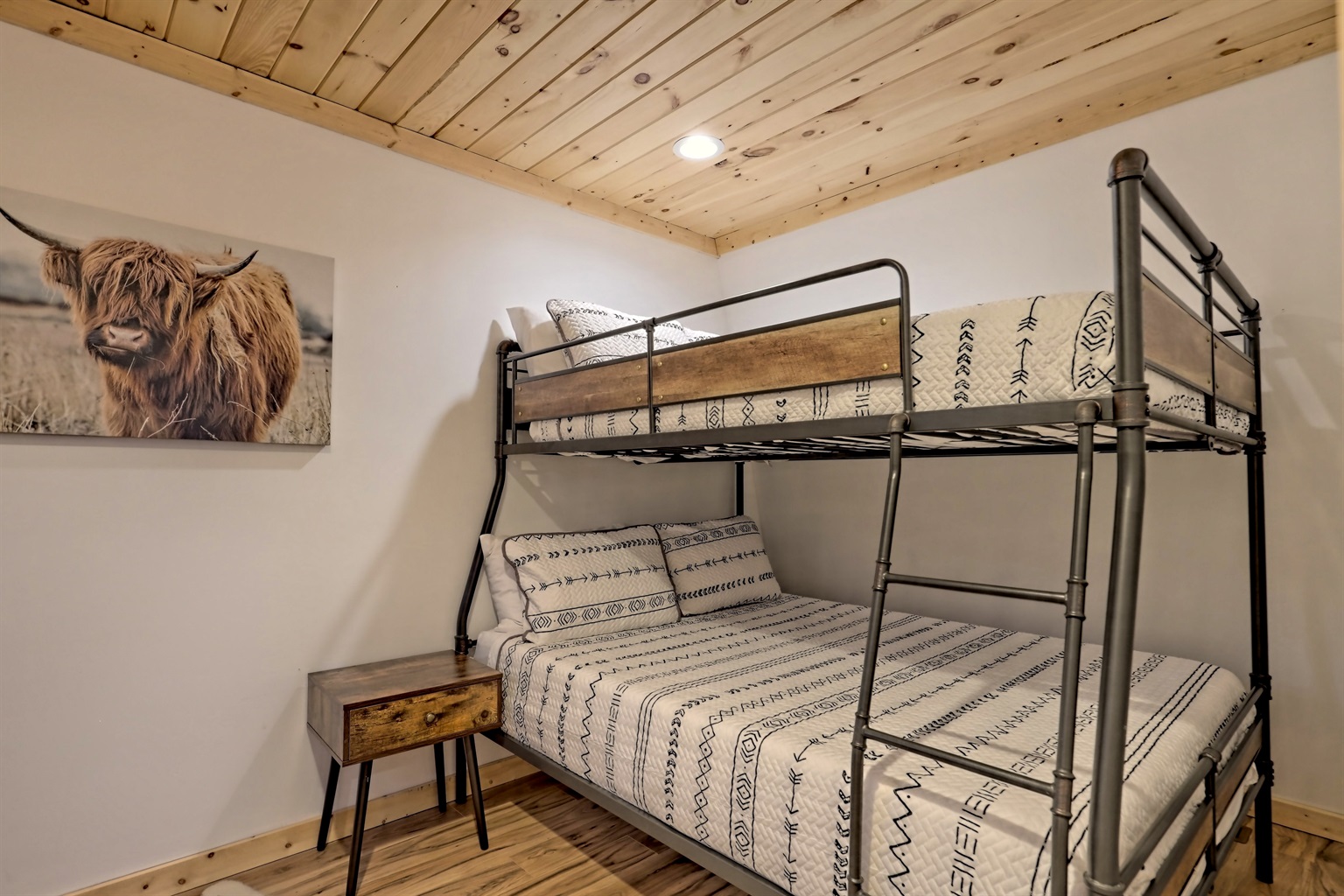 Head upstairs to the master bedroom, where you'll wake up to stunning mountain views every morning. The bunked bedroom, featuring a full XL over queen bed, is perfect for both kids and adults alike, ensuring a comfortable night's sleep for everyone.