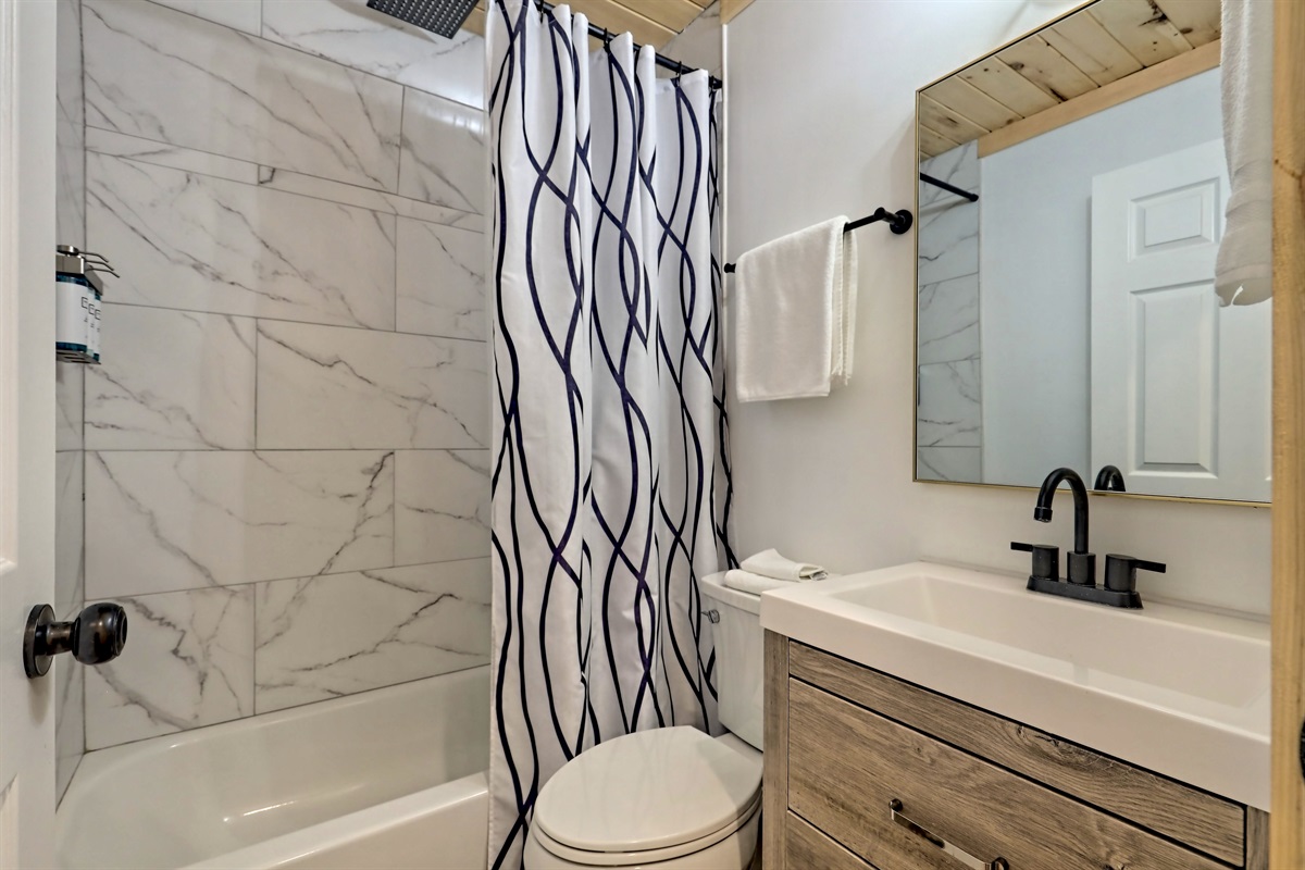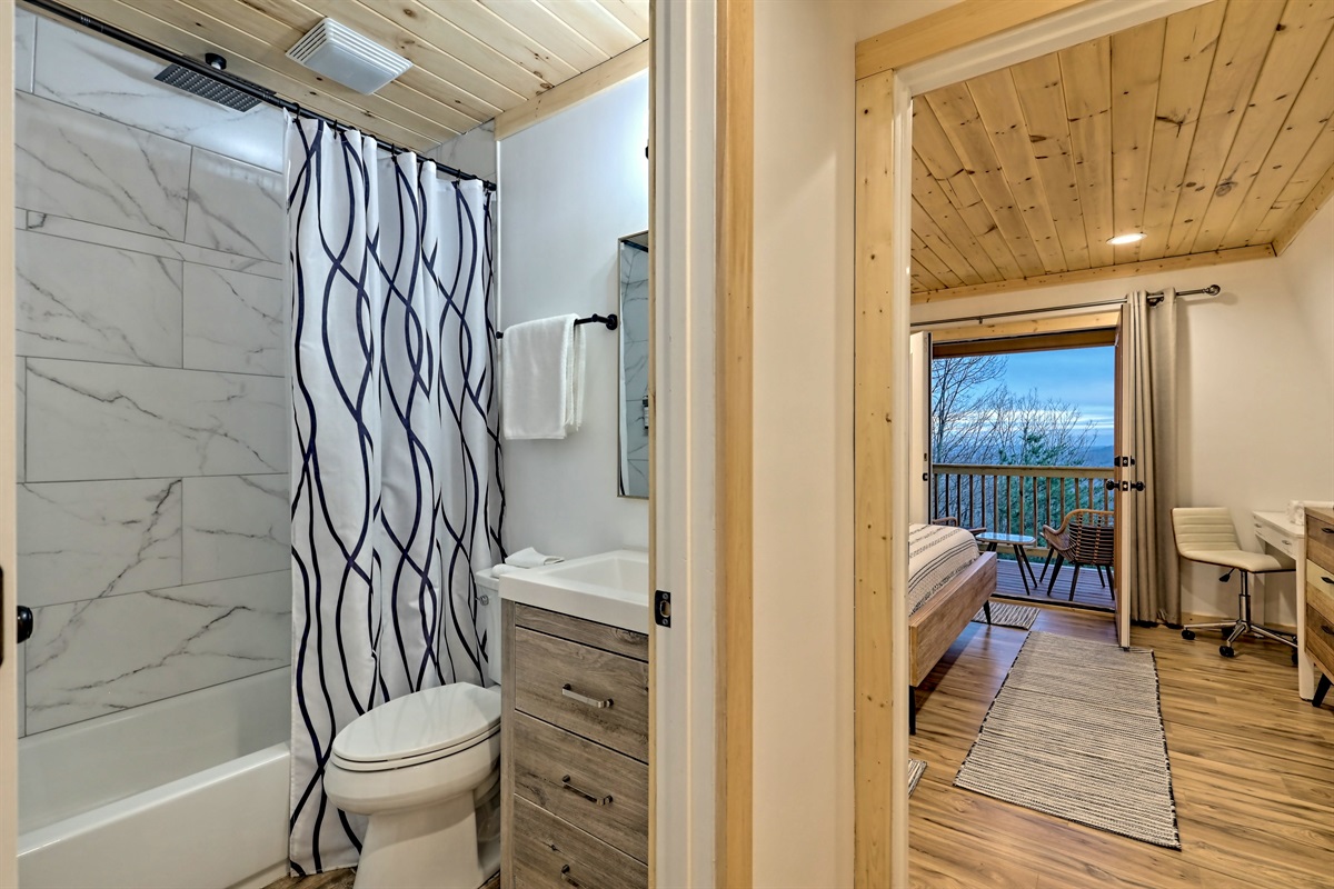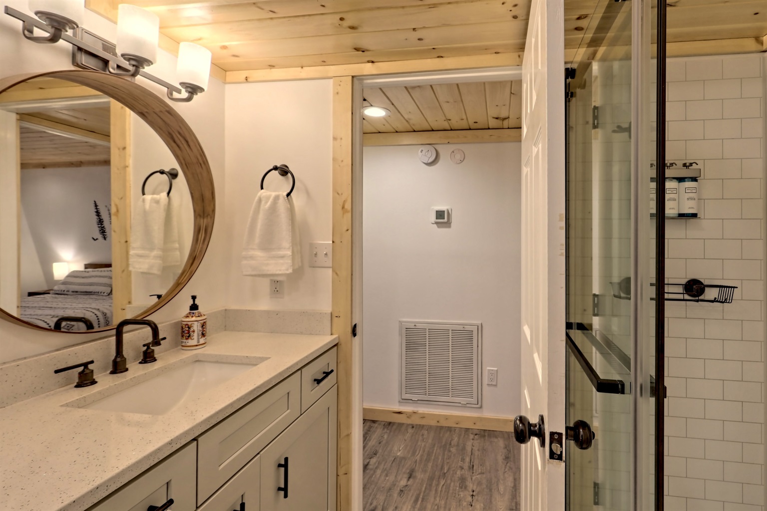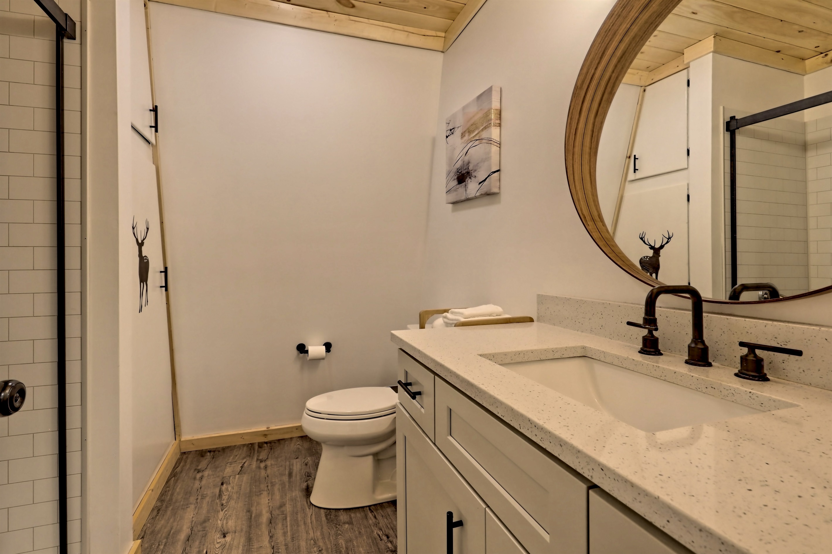 Head upstairs to the master bedroom, where you'll wake up to stunning mountain views every morning. The bunked bedroom, featuring a full XL over queen bed, is perfect for both kids and adults alike, ensuring a comfortable night's sleep for everyone.