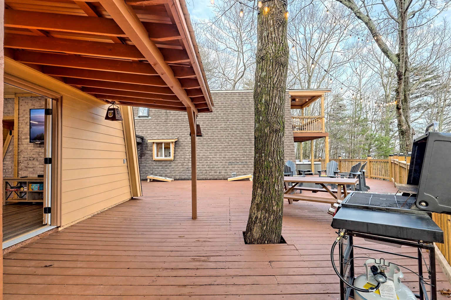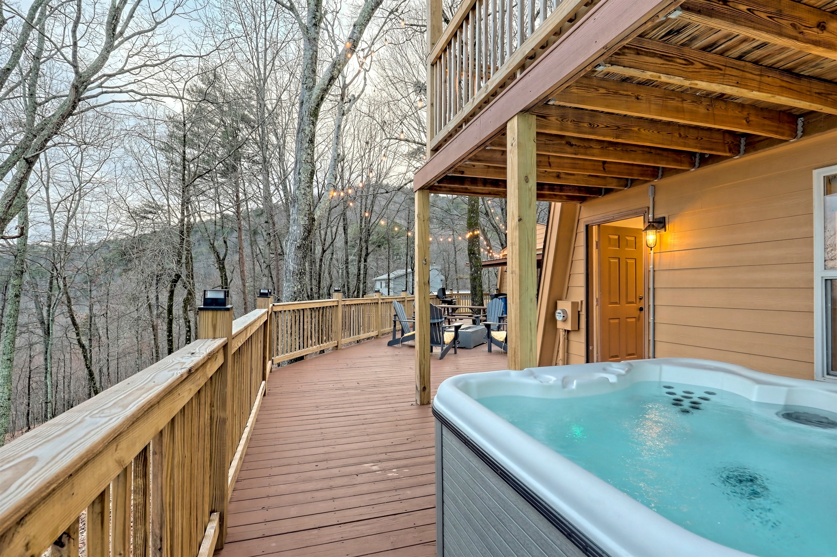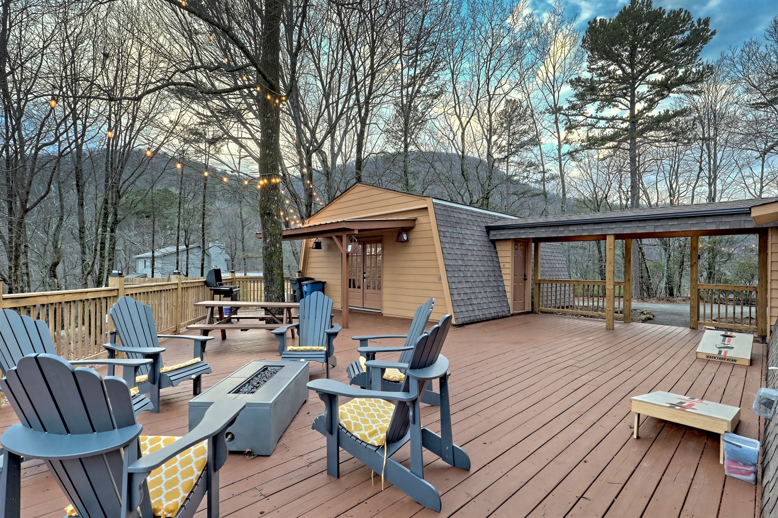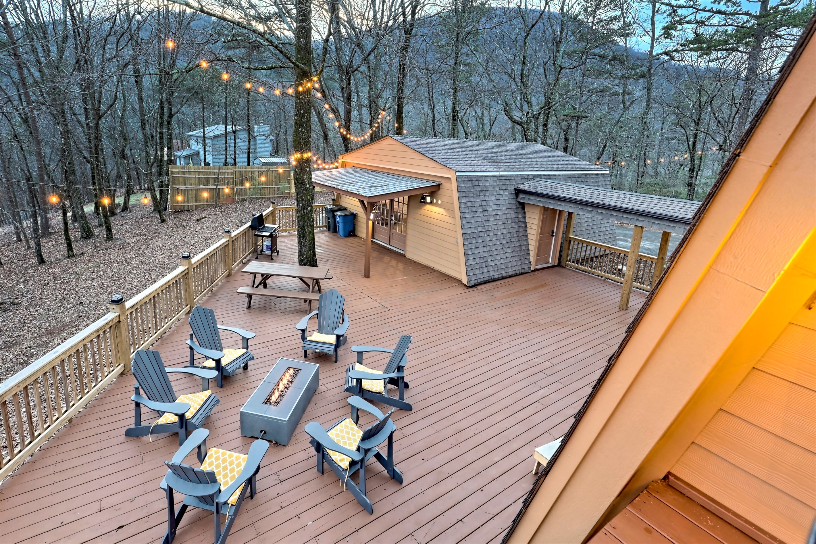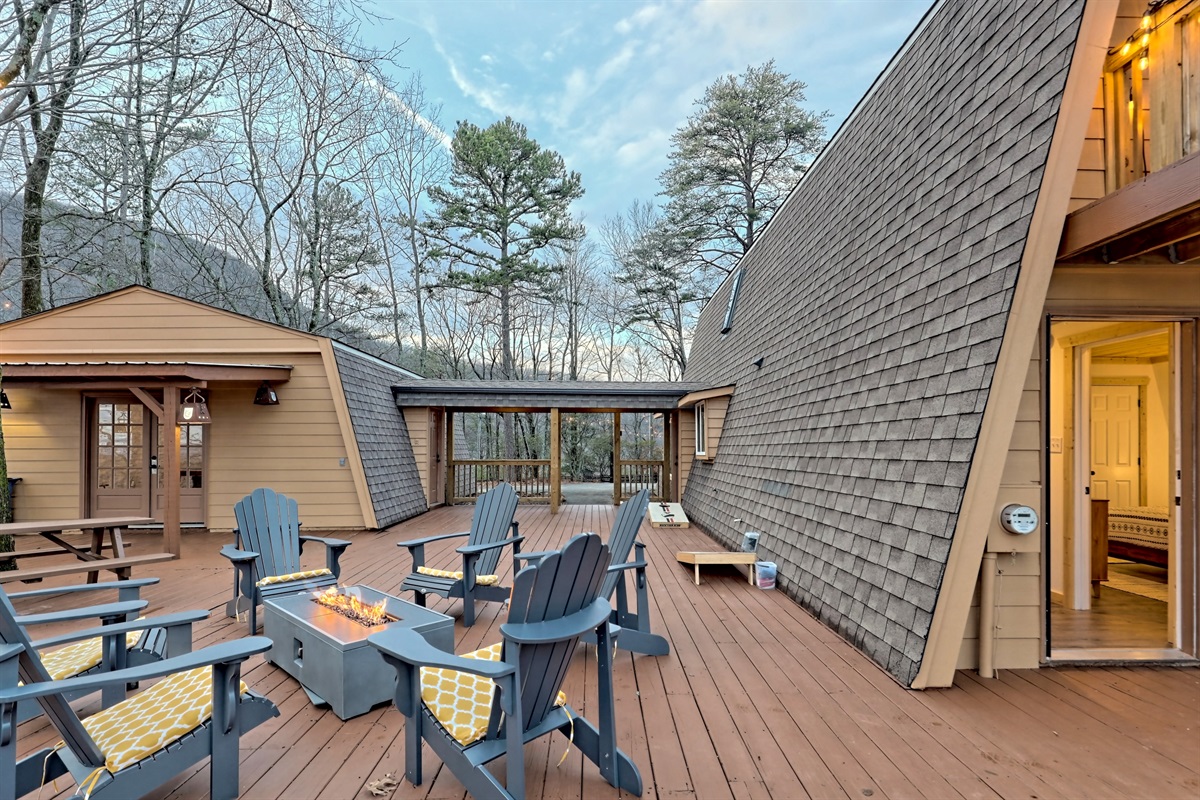 Step outside onto the expansive deck and take in the fresh mountain air. Two fire pits, one gas and one for wood, provide the perfect ambiance for cozy evenings spent under the stars. Relax and unwind in the hot tub, or fire up the gas grill for a delicious barbecue feast.