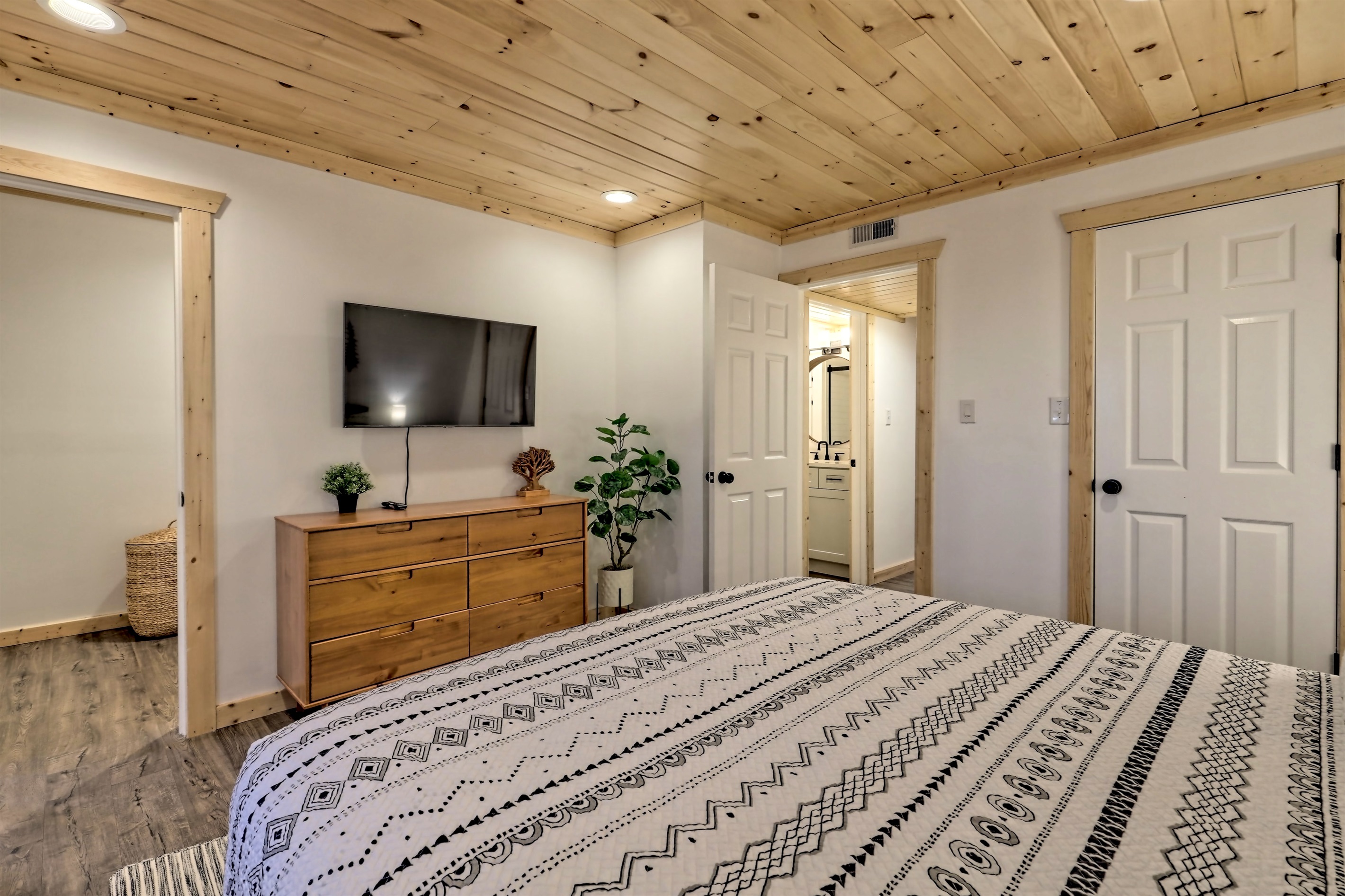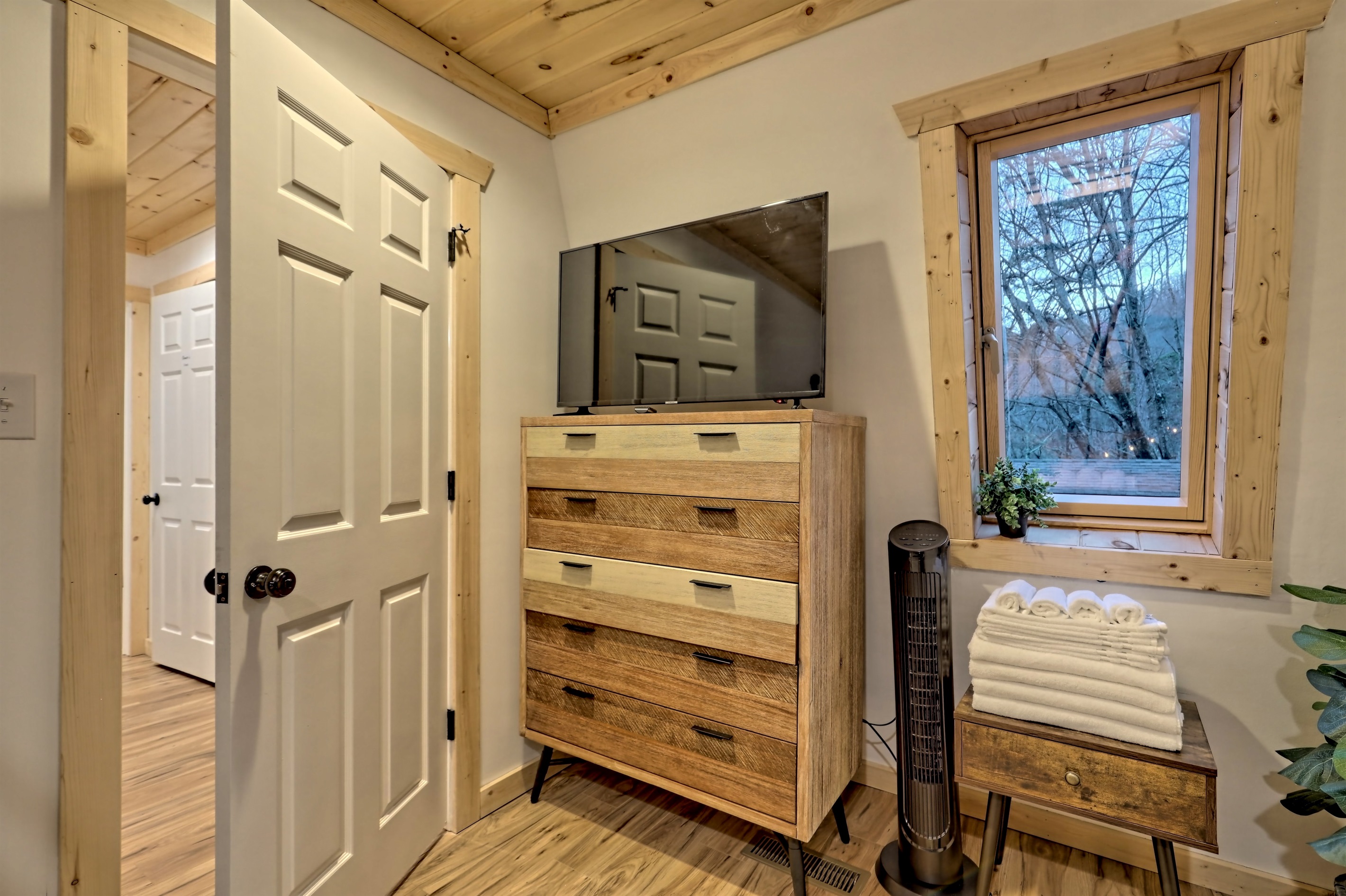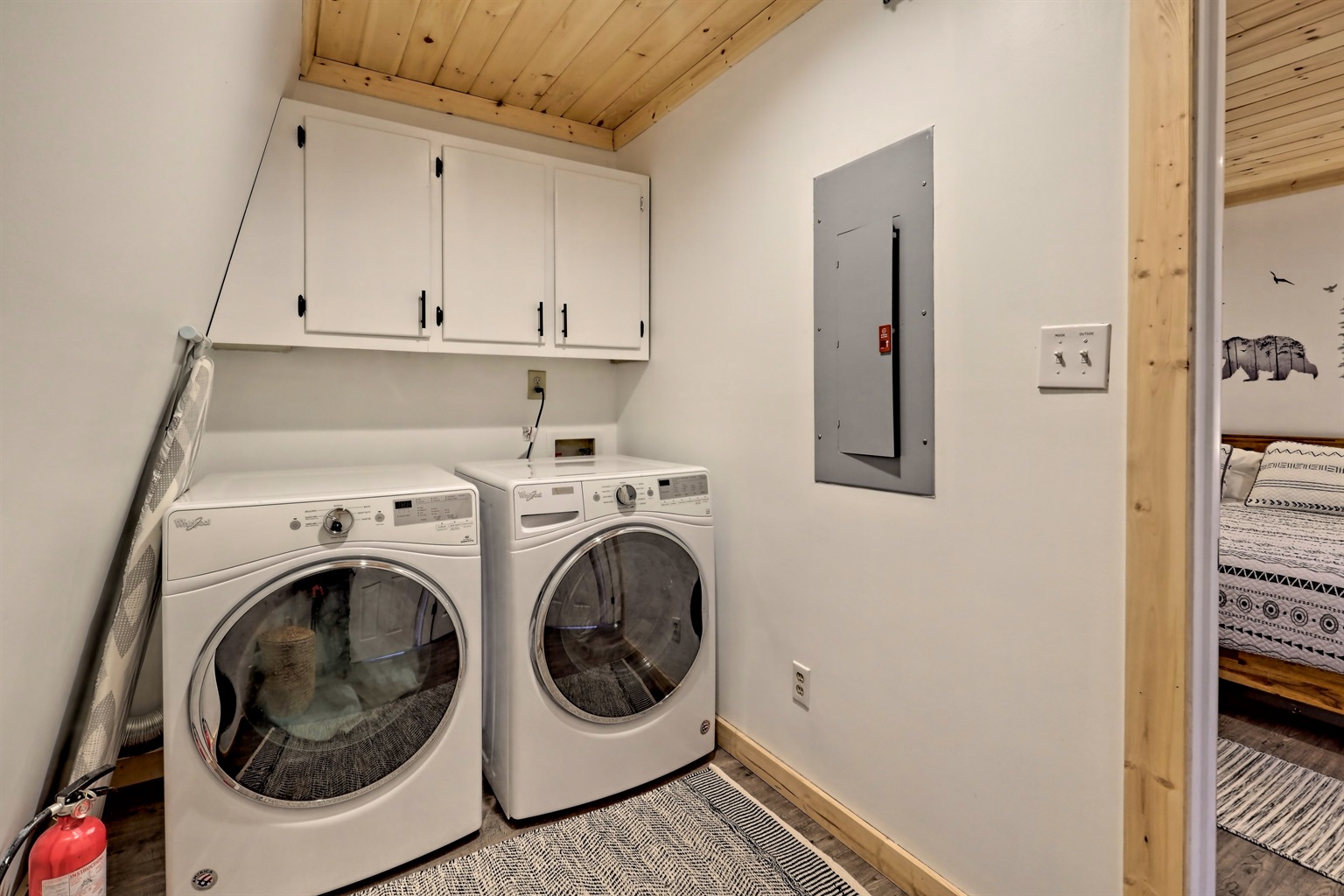 Welcome to our luxurious 3-bedroom A-frame cabin nestled in the heart of the mountains. As you enter, you'll be greeted by a spacious living room adorned with towering windows that showcase the breathtaking natural beauty surrounding the cabin. On the first floor, you'll find a sumptuous king-size bed and convenient laundry facilities for added convenience.