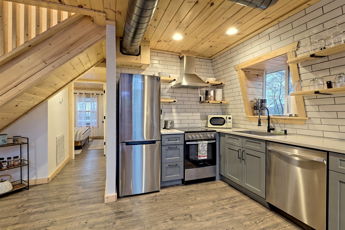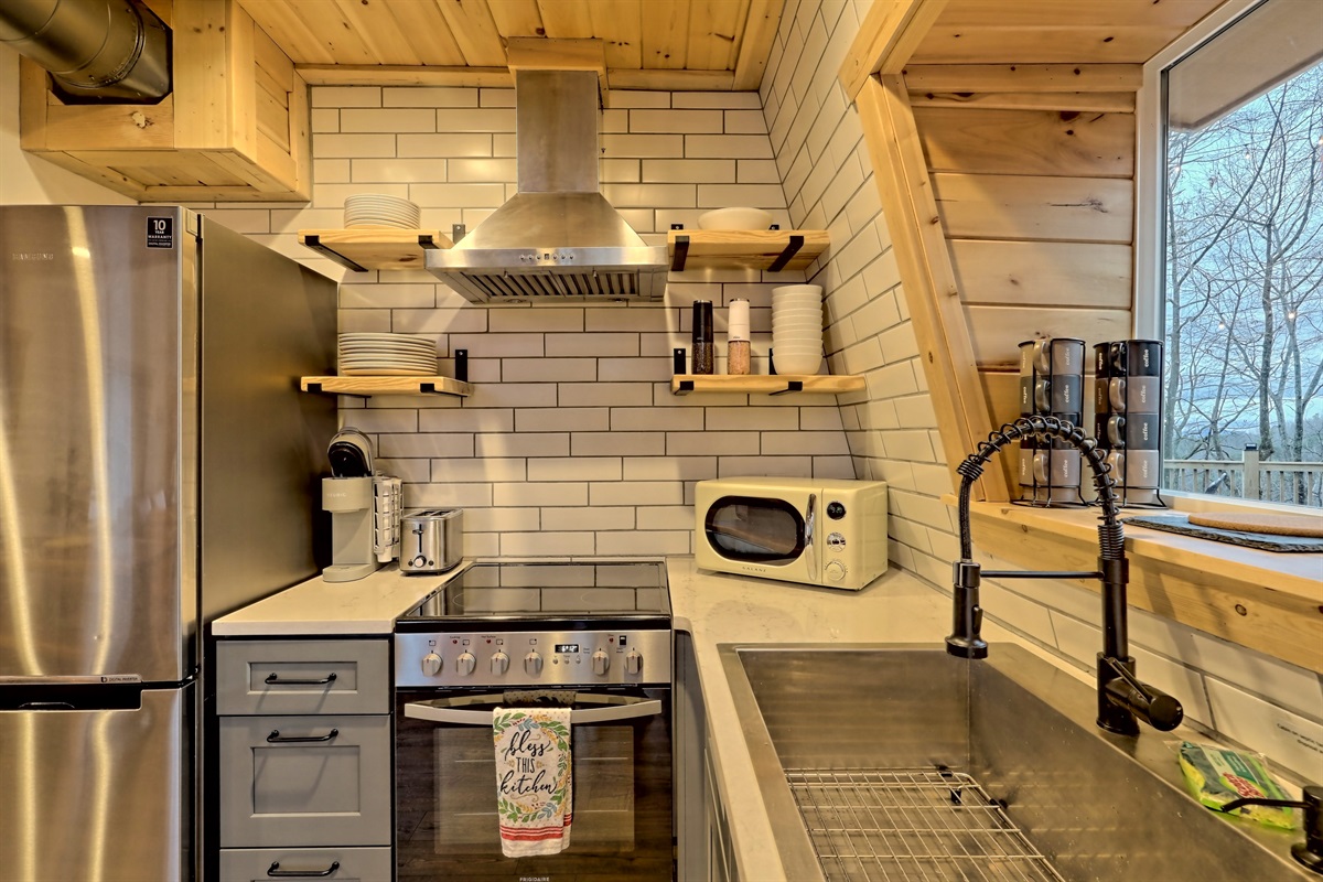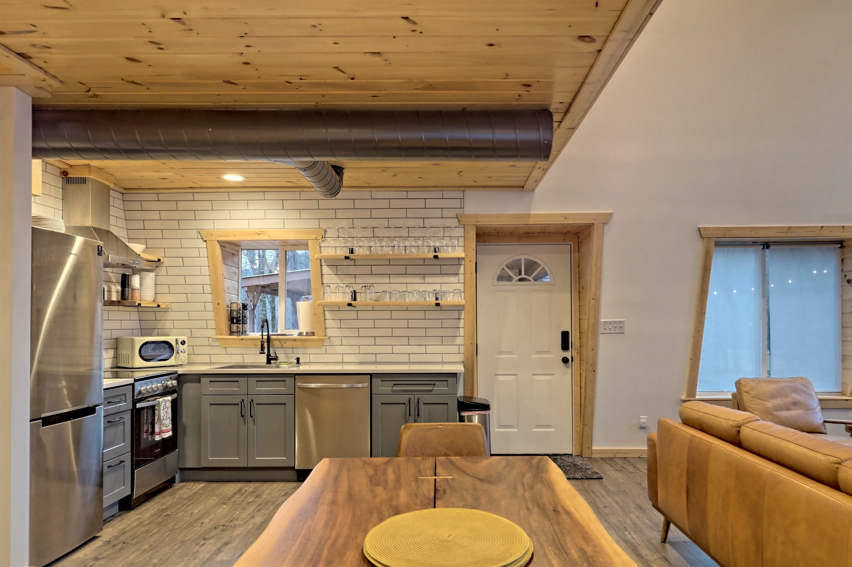 Welcome to our luxurious 3-bedroom A-frame cabin nestled in the heart of the mountains. As you enter, you'll be greeted by a spacious living room adorned with towering windows that showcase the breathtaking natural beauty surrounding the cabin. On the first floor, you'll find a sumptuous king-size bed and convenient laundry facilities for added convenience.
