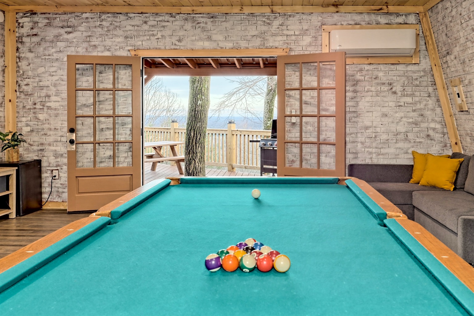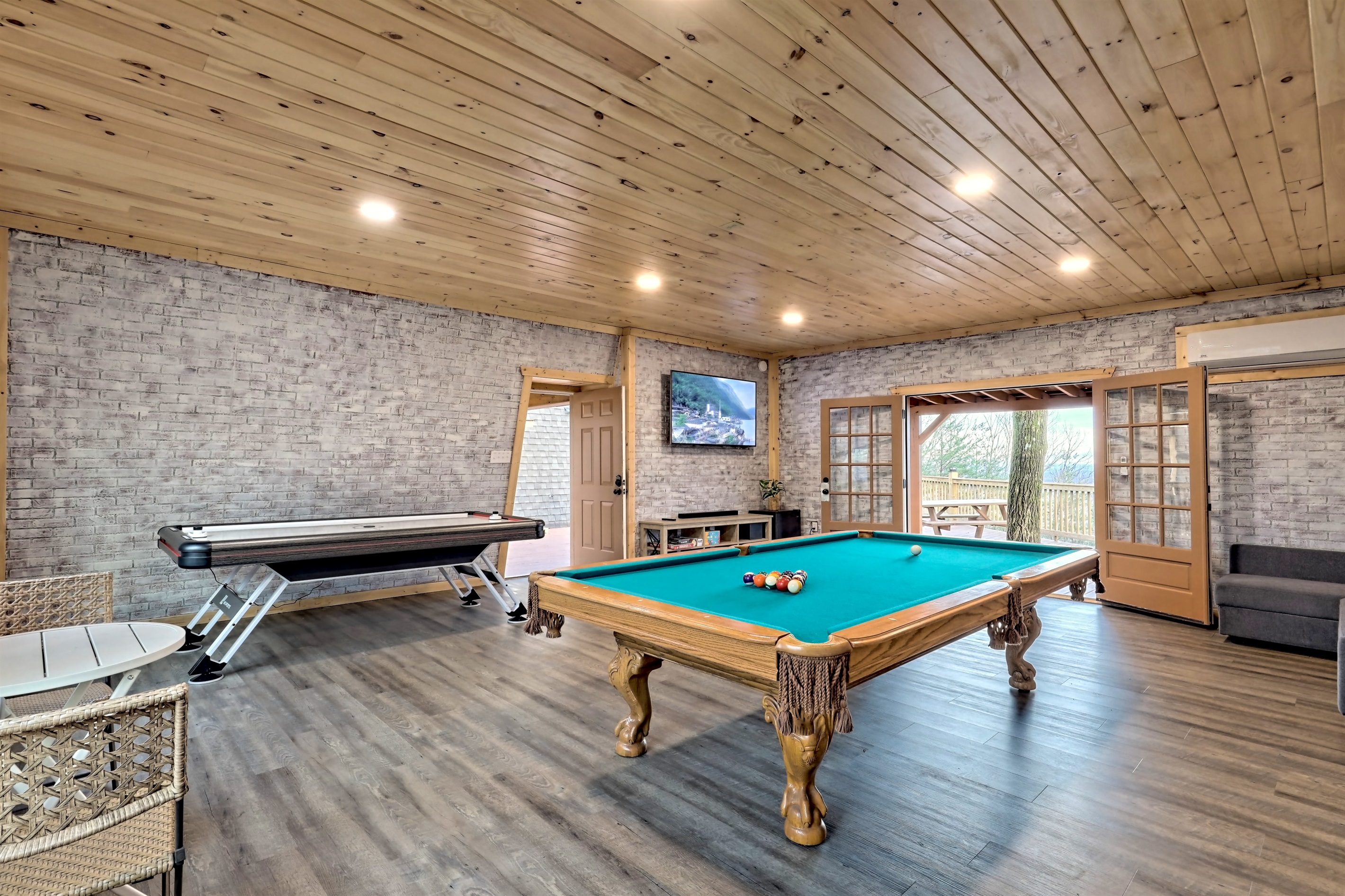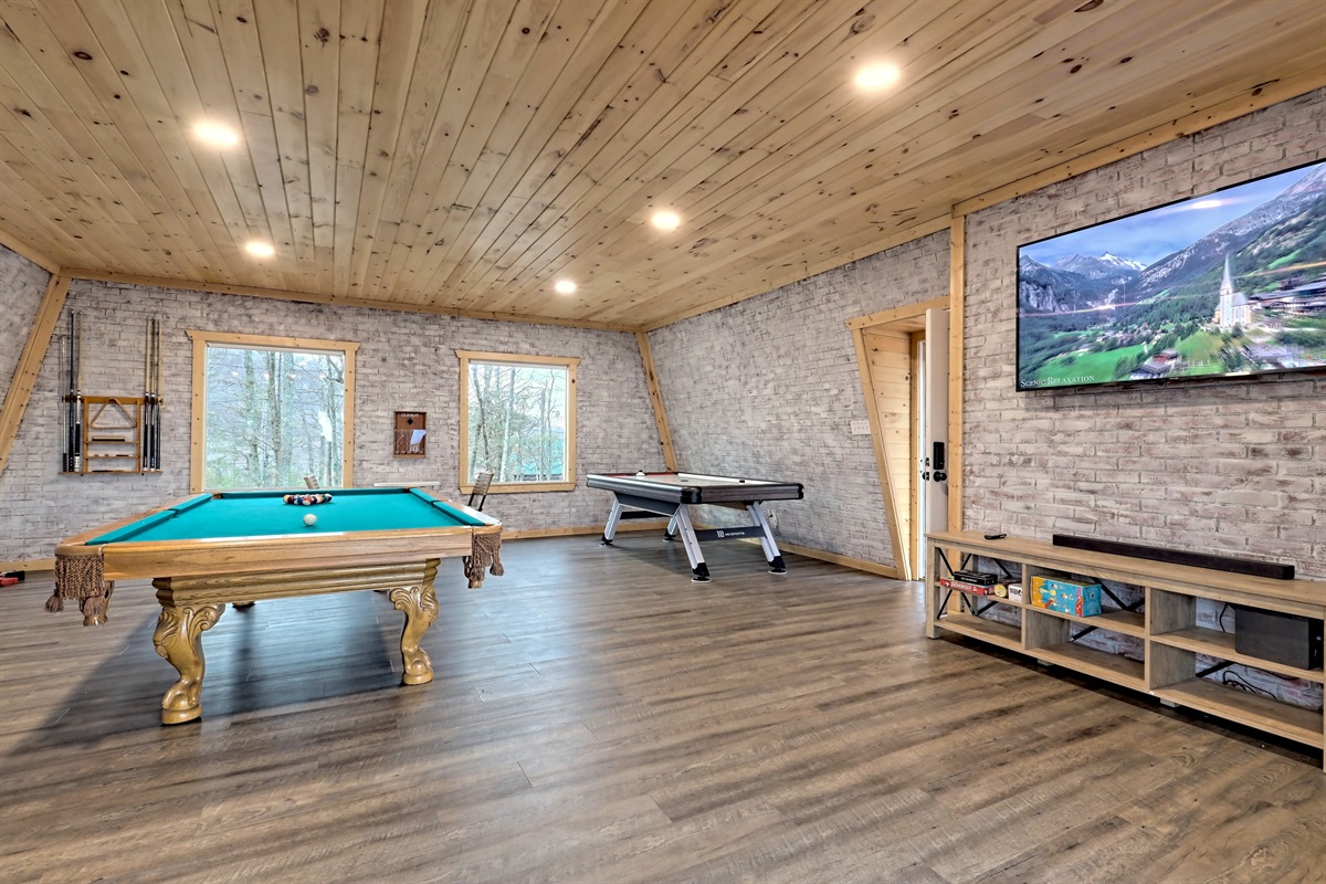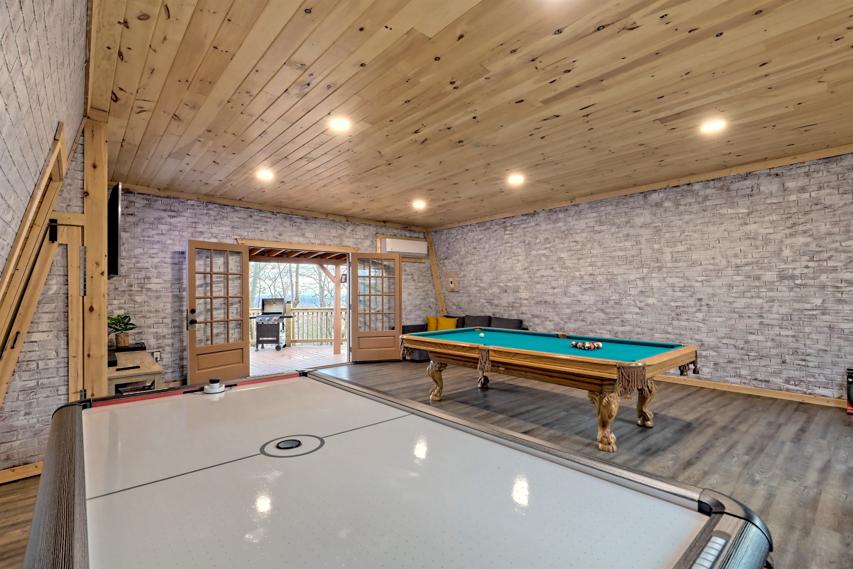 Entertainment awaits in the separate game room, complete with a pool table, air hockey, darts, arcade games, an Xbox, and a sleeper sofa for additional guests.